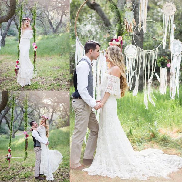 Vintage Bohemia Wedding Dresses 2019 Off Shoulder Crochet Lace