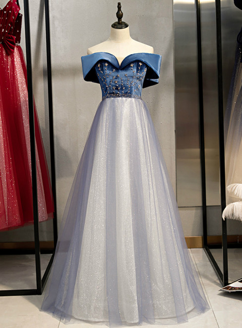 A Line Off The Shoulder Floor Length Blue Tulle Bridesmaid Dress