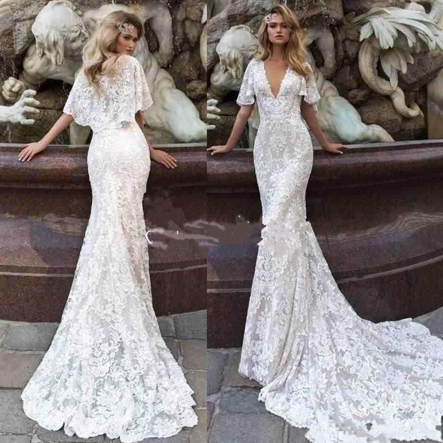 2019 Modern Deep V Neck Full Lace Mermaid Wedding Dresses Cape