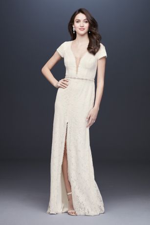 Illusion Deep V Neck Cap Sleeve Lace Wedding Dress David S Bridal