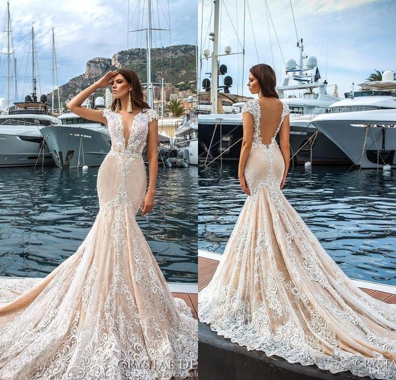 2017 Gorgeous Full Lace Mermaid Wedding Dresses Deep V Neck Capped
