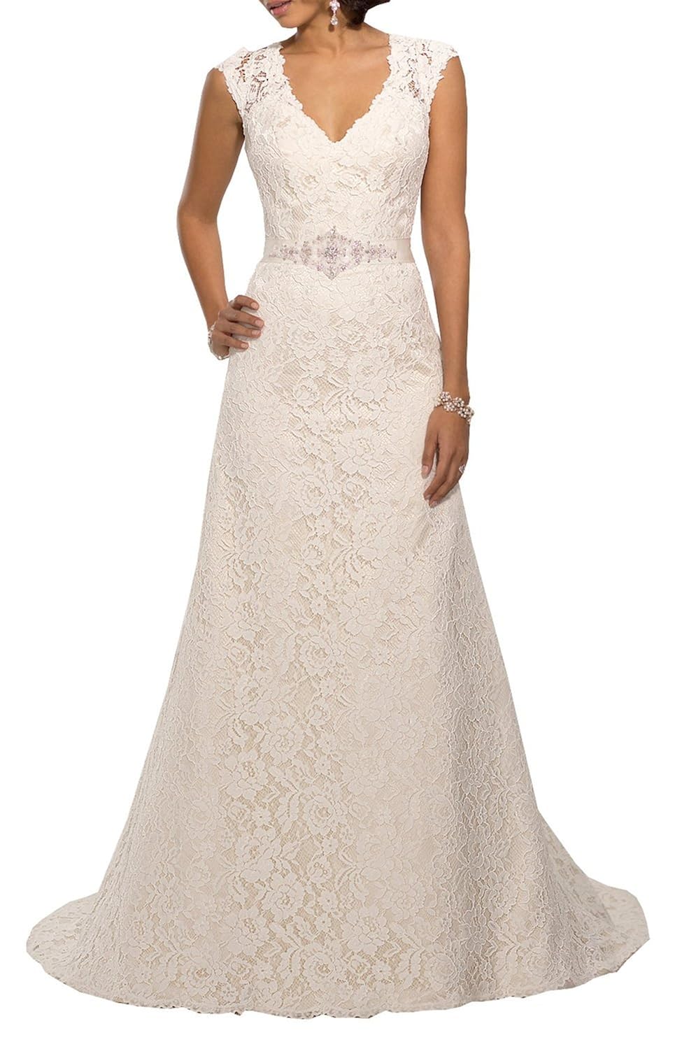 Amazon Com Firstl V Neckline A Line Cap Sleeve Lace Over Satin