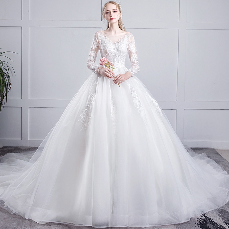 Long Sleeve Wedding Dress 2020 Lace White Ball Gown Muslim Court