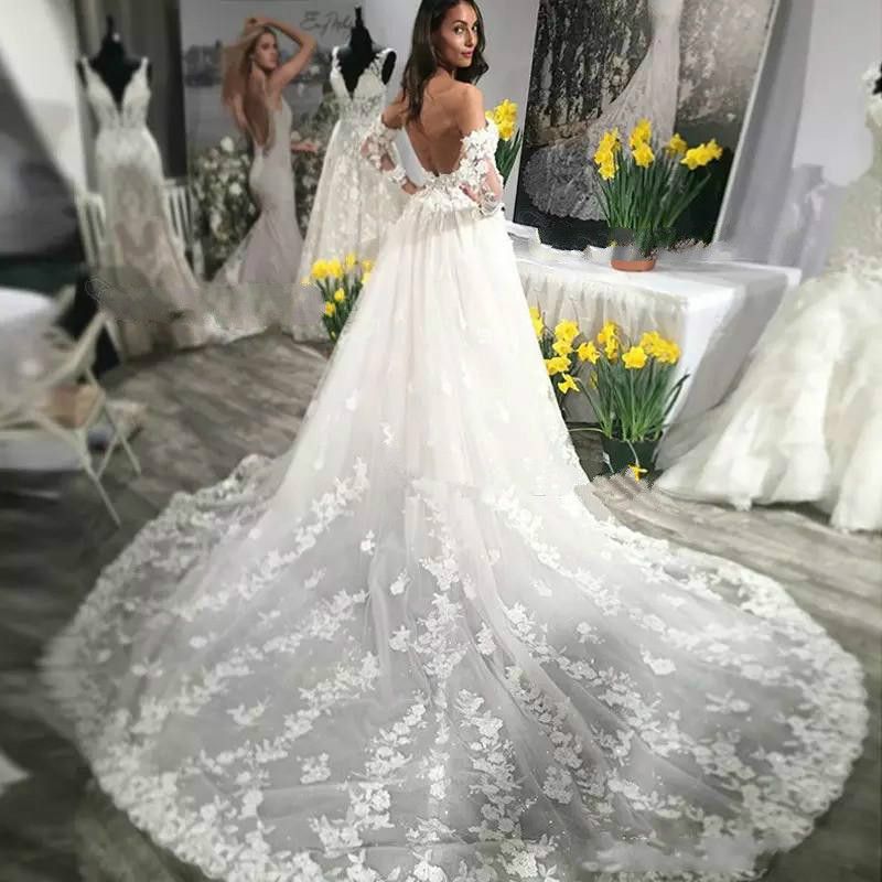 Vintage White Cream Lace Floral Flowy Train Long Sleeve Wedding