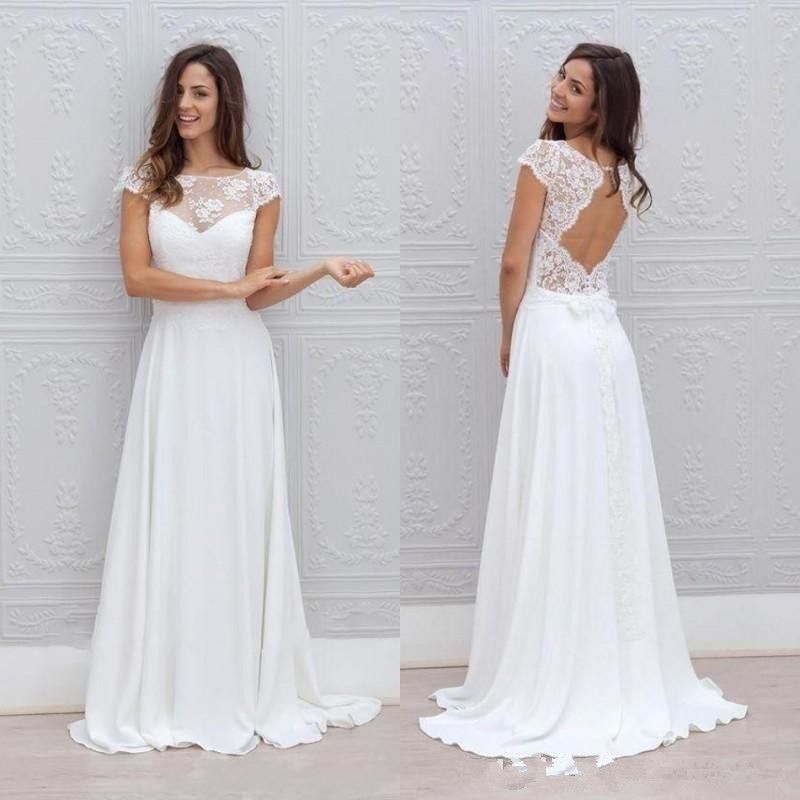 Discount Beach Bohemian Wedding Dresses Illusion Neckline Capped